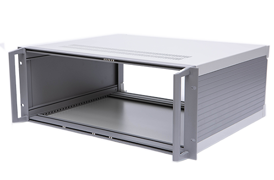 B型機箱由上蓋板,下蓋板,前面板,后面板,側板,前后梁,帶耳把手等配件組裝而成,為機架式機箱,把手兩側帶有耳朵直接固定的機器內。